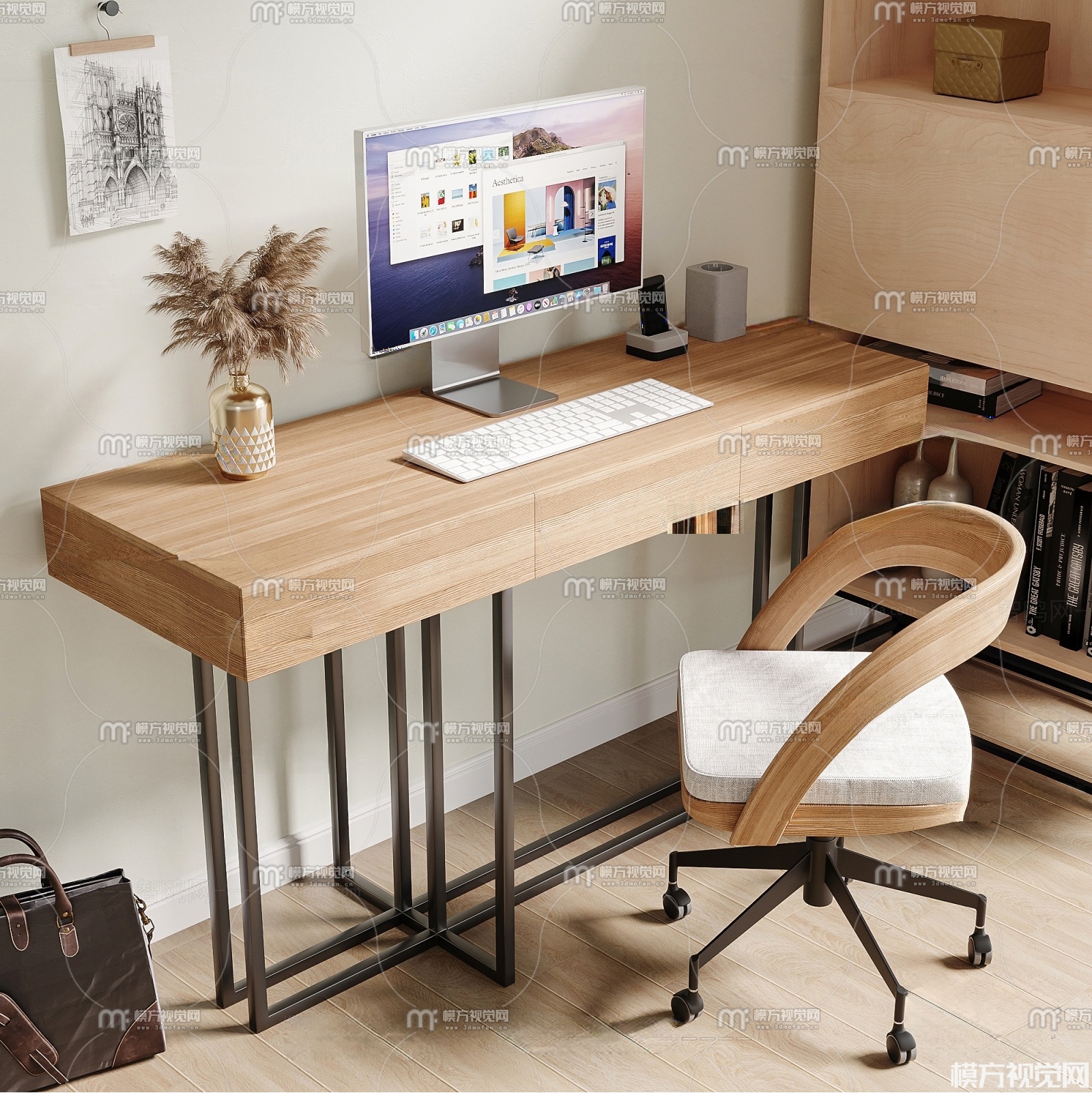北欧实木书桌椅3D模型(ID:0031825)
