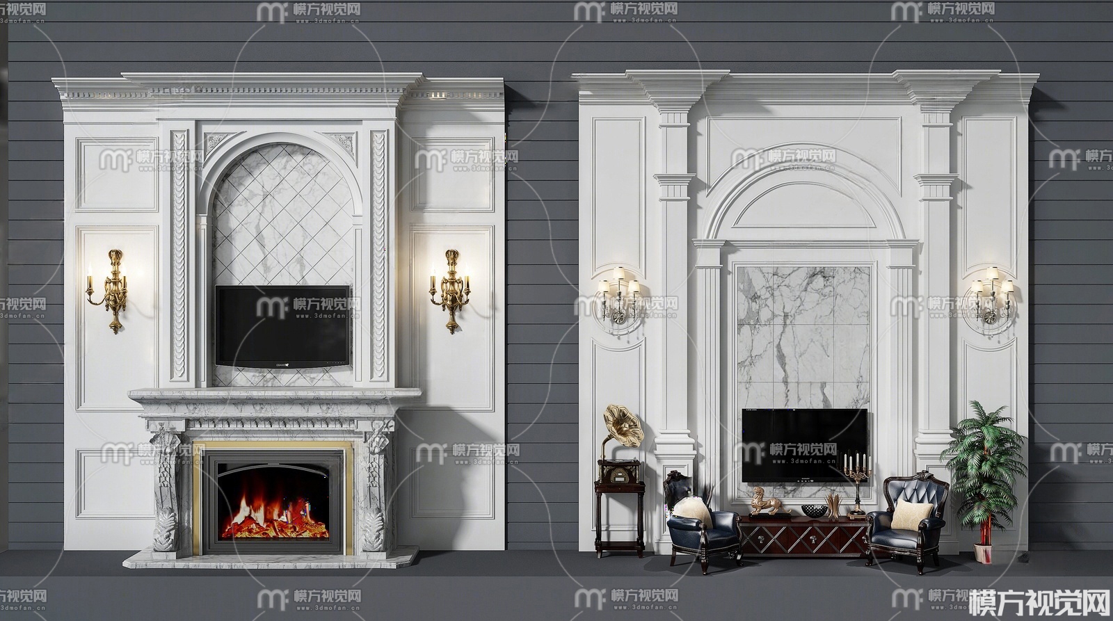 简欧电视背景墙壁炉3D模型(ID:0032267)