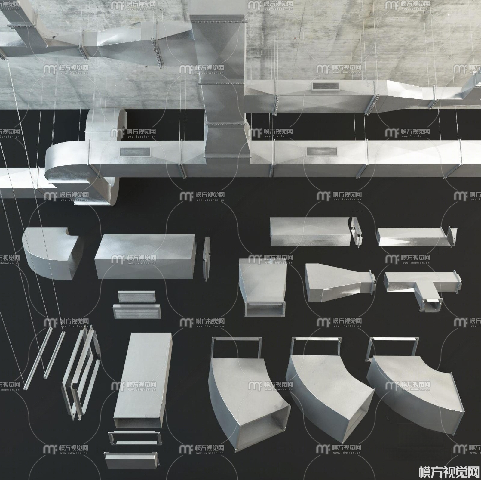 现代工业通风管道组合3D模型(ID:0034525)
