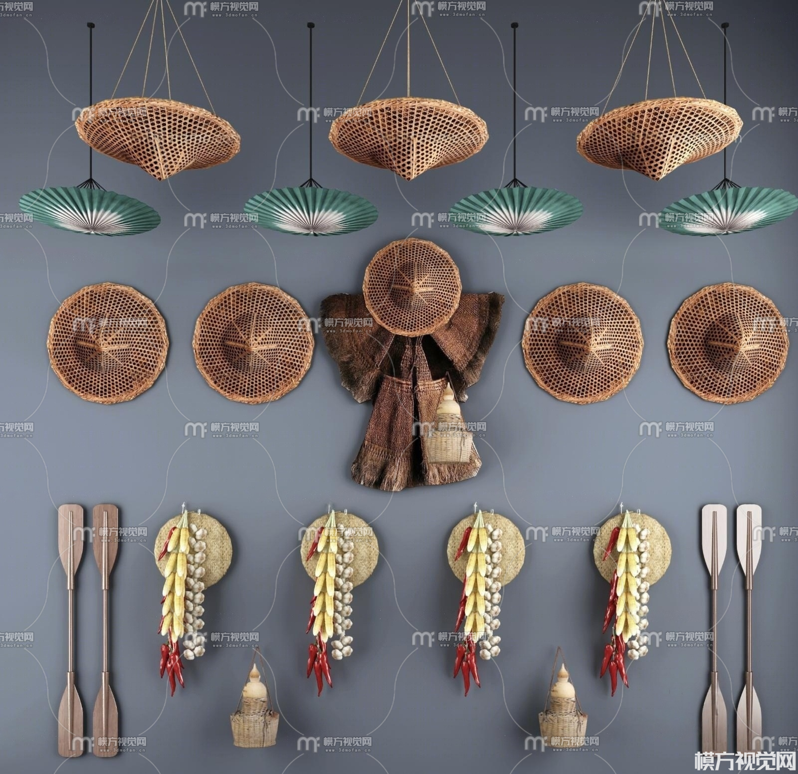 中式农庄竹藤斗笠油纸伞3D模型(ID:0035868)