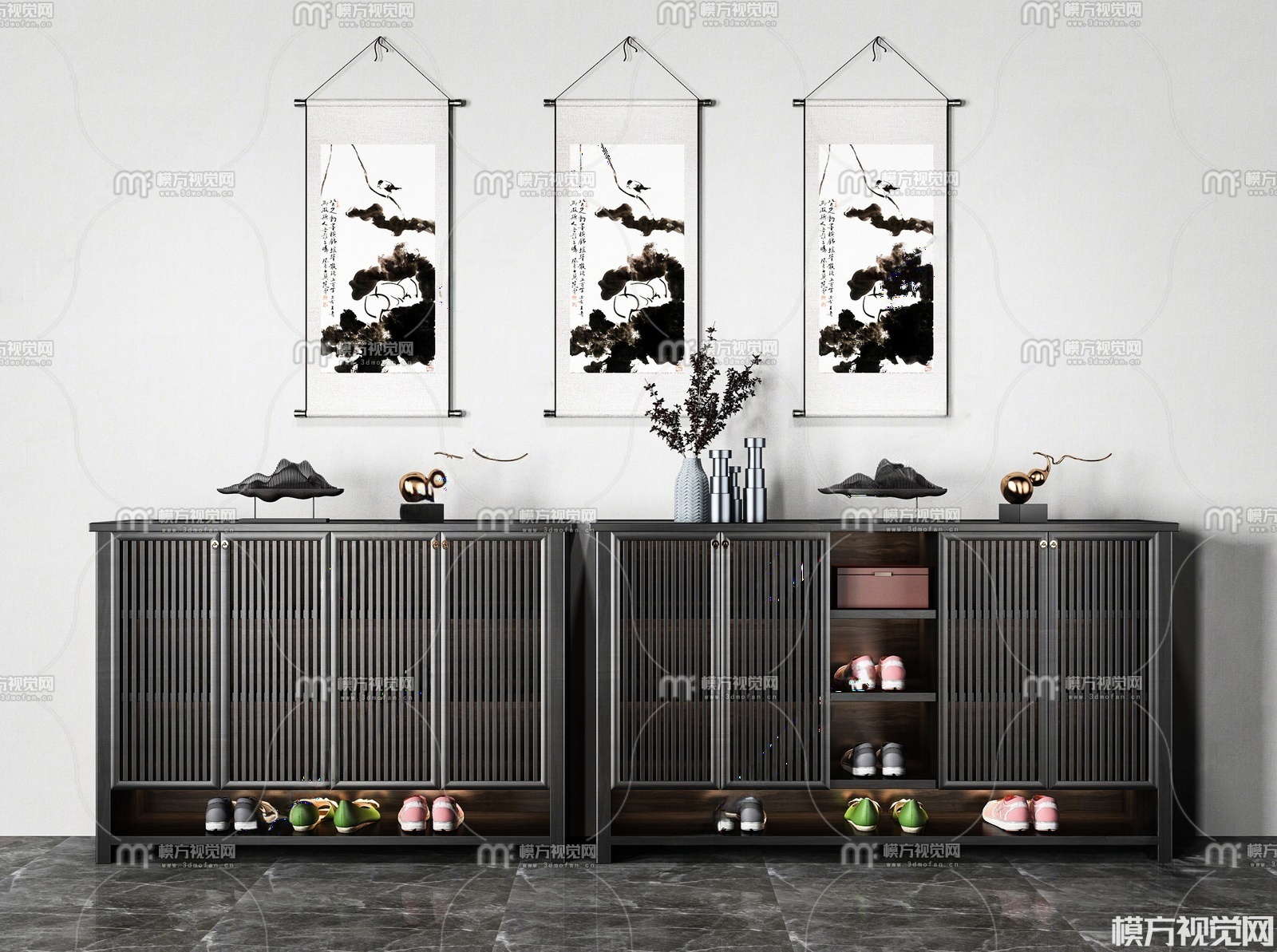 新中式多功能实木鞋柜组合3D模型(ID:0036100)