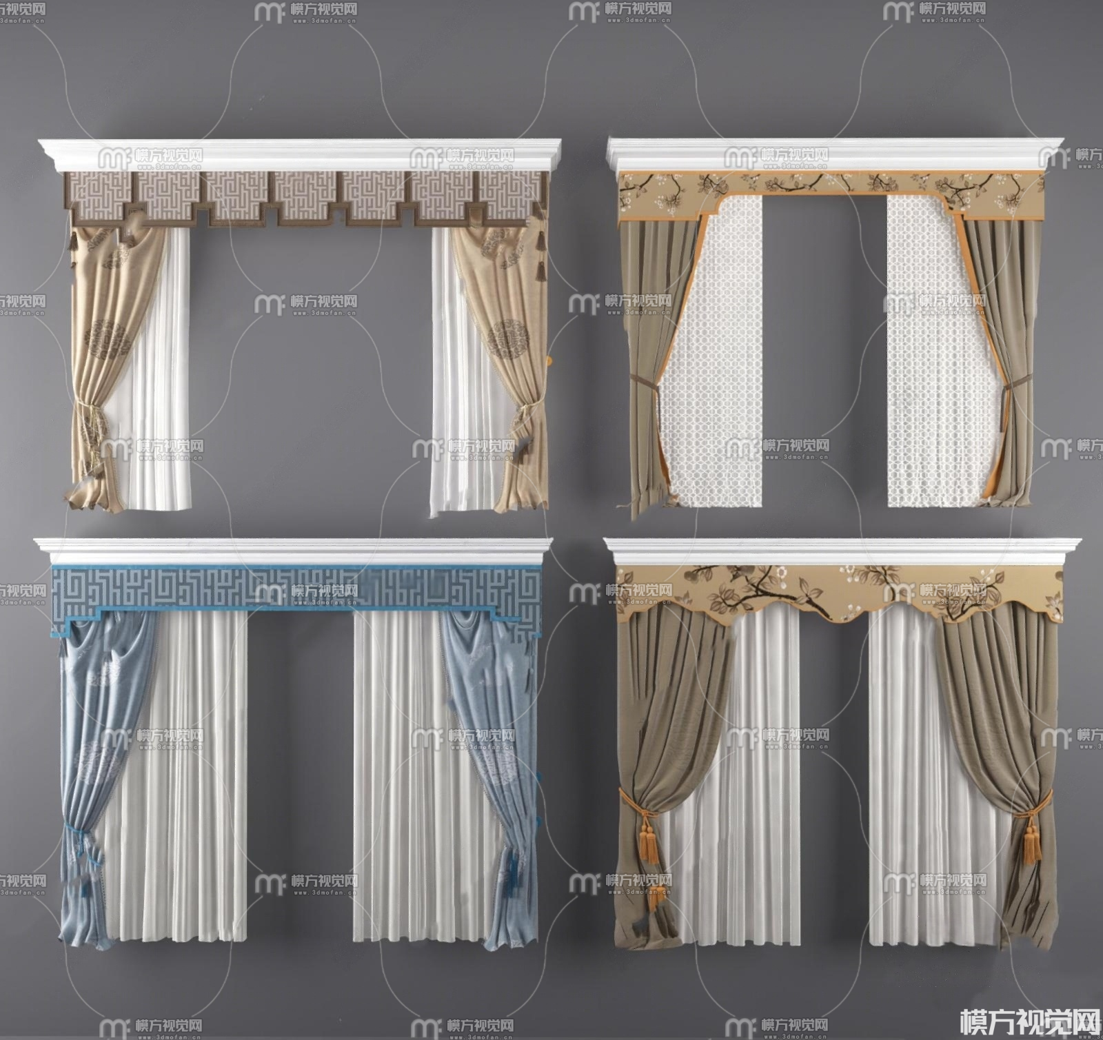 新中式布艺窗帘组合3D模型(ID:0036471)