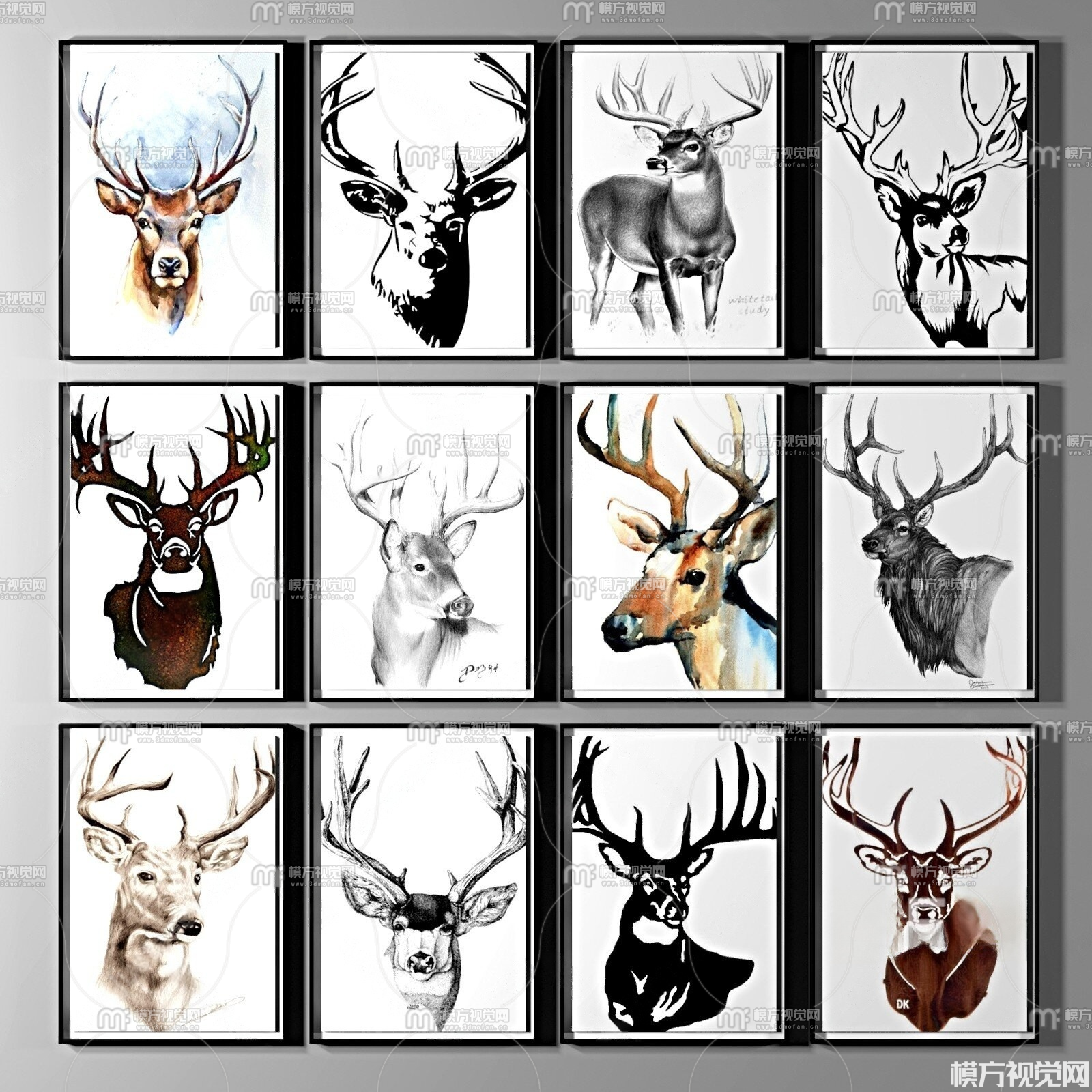 现代麋鹿彩色黑挂画饰画组合3D模型(ID:0037196)