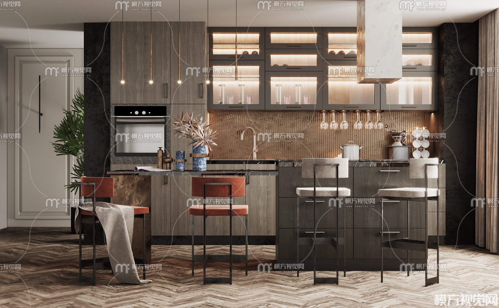 现代轻奢开放式厨房吧台3D模型(ID:0003721)