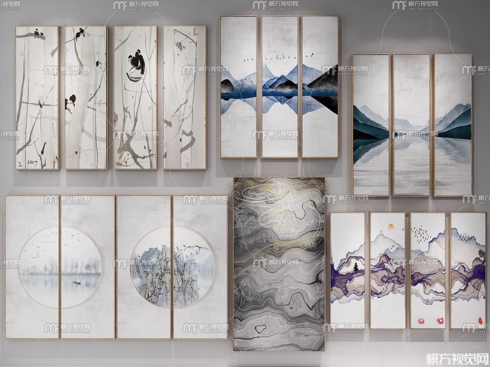 新中式禅意意境挂画组合3D模型(ID:0037297)