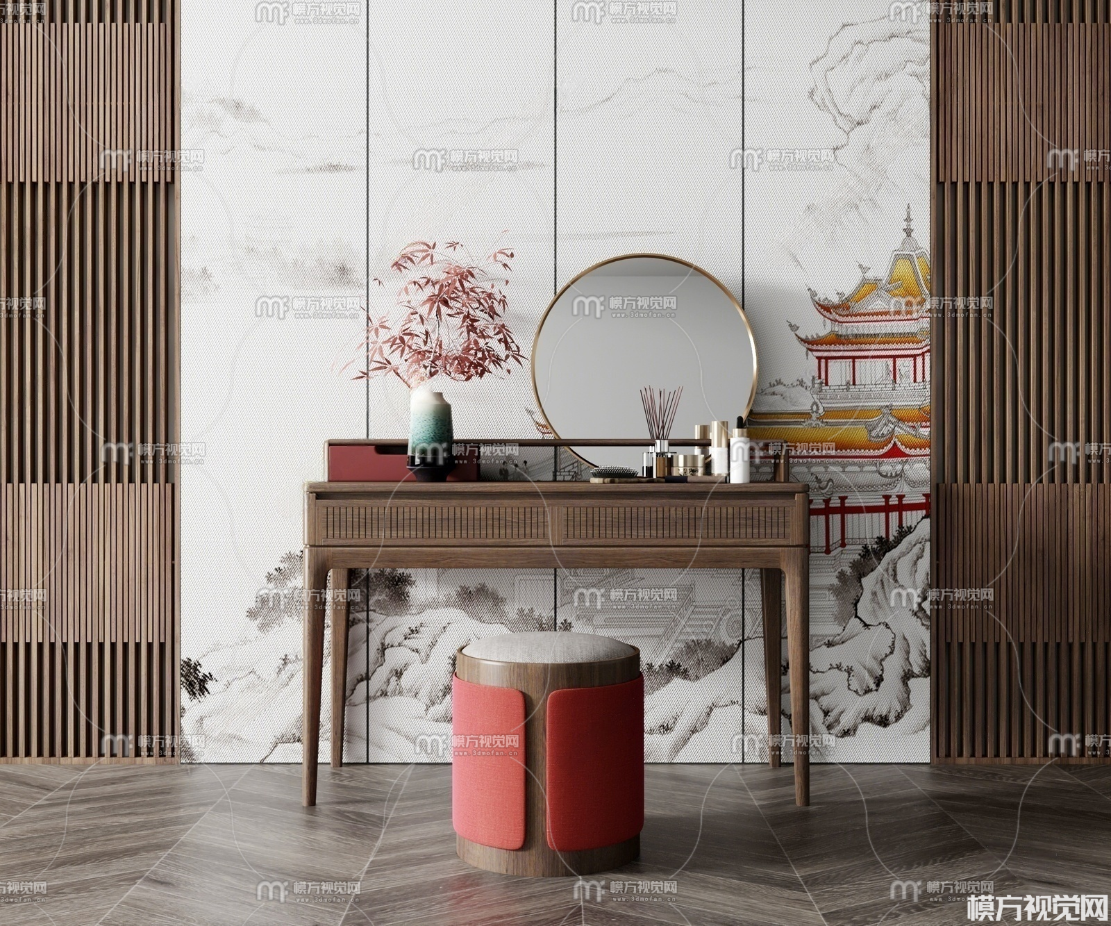 新中式妆台妆椅组合3D模型(ID:0037806)