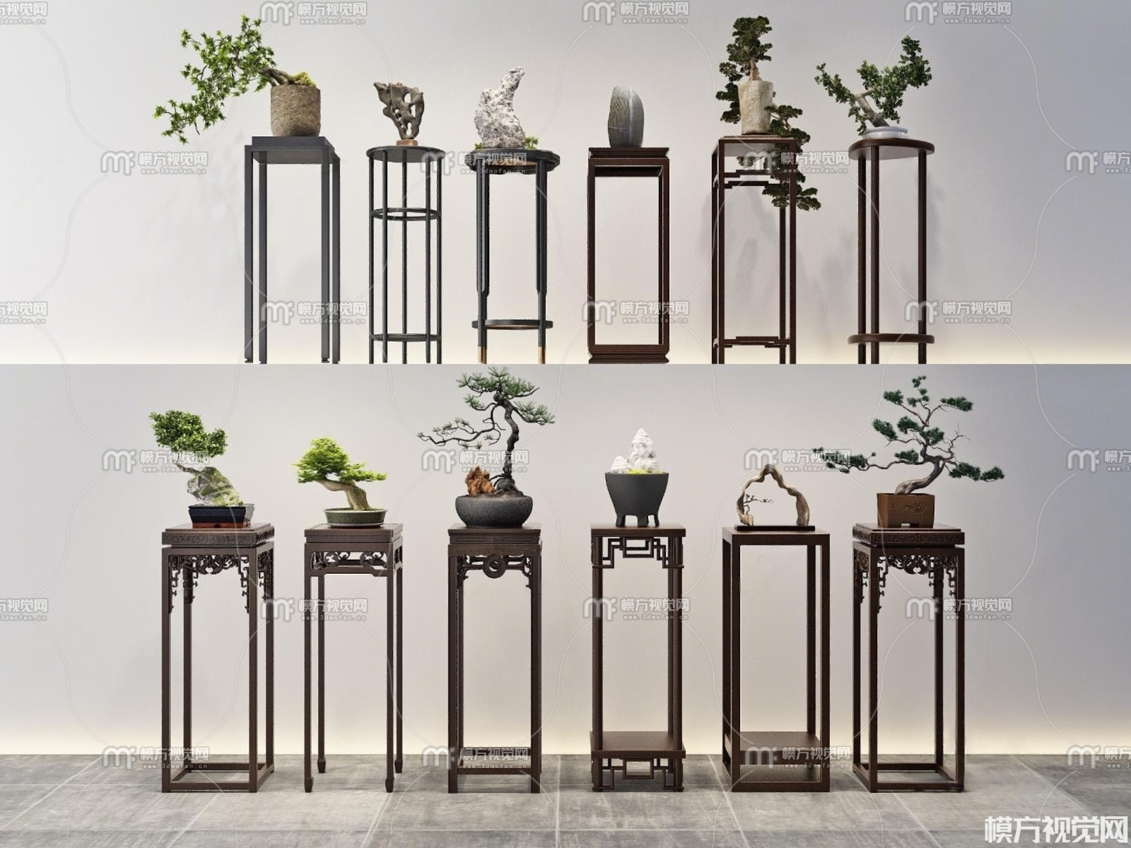 新中式花架盆栽台组合3D模型(ID:0038334)
