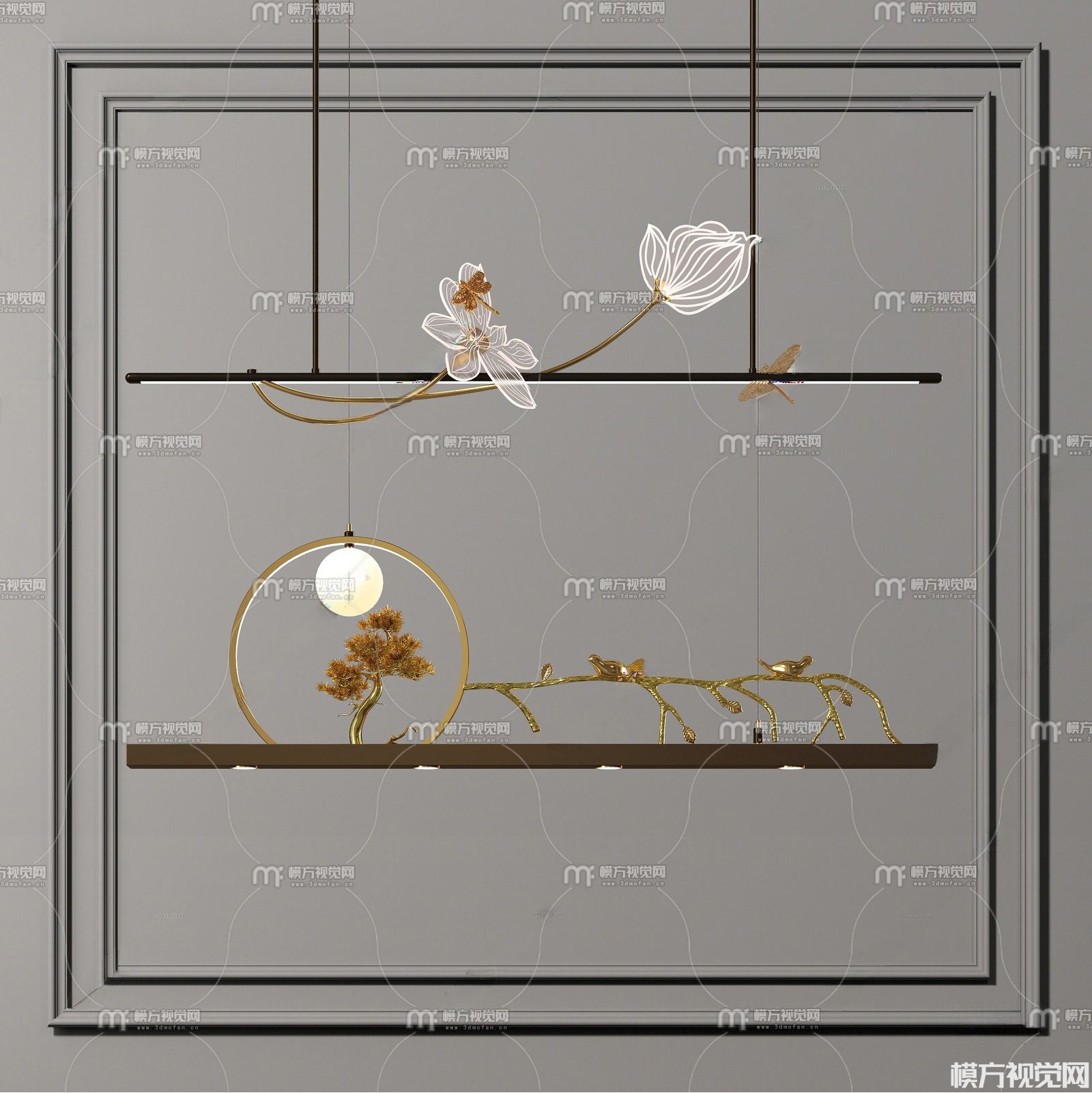 新中式禅意吊灯组合3D模型(ID:0038747)