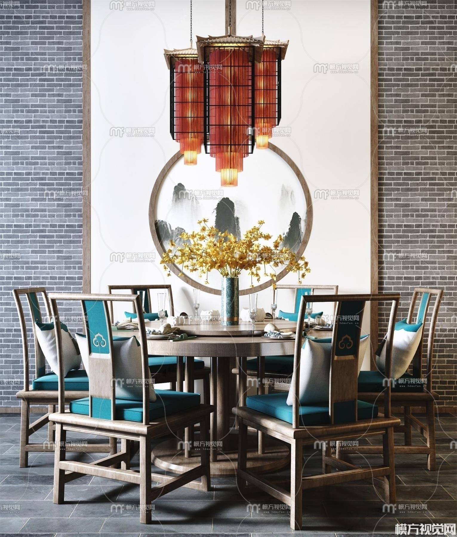 新中式圆形餐桌椅组合3D模型(ID:0000414)