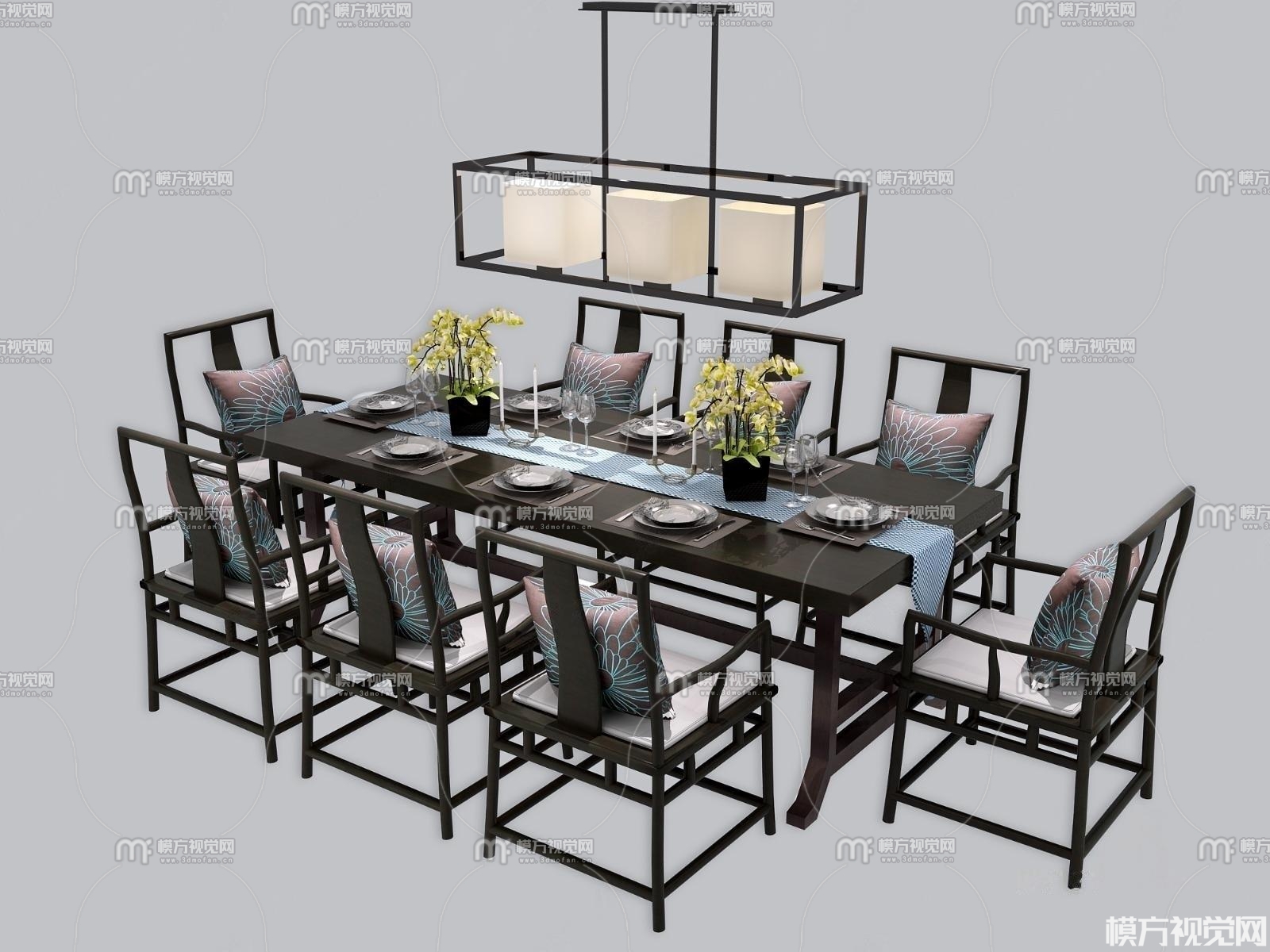 新中式餐桌椅吊灯组合3D模型(ID:0000415)