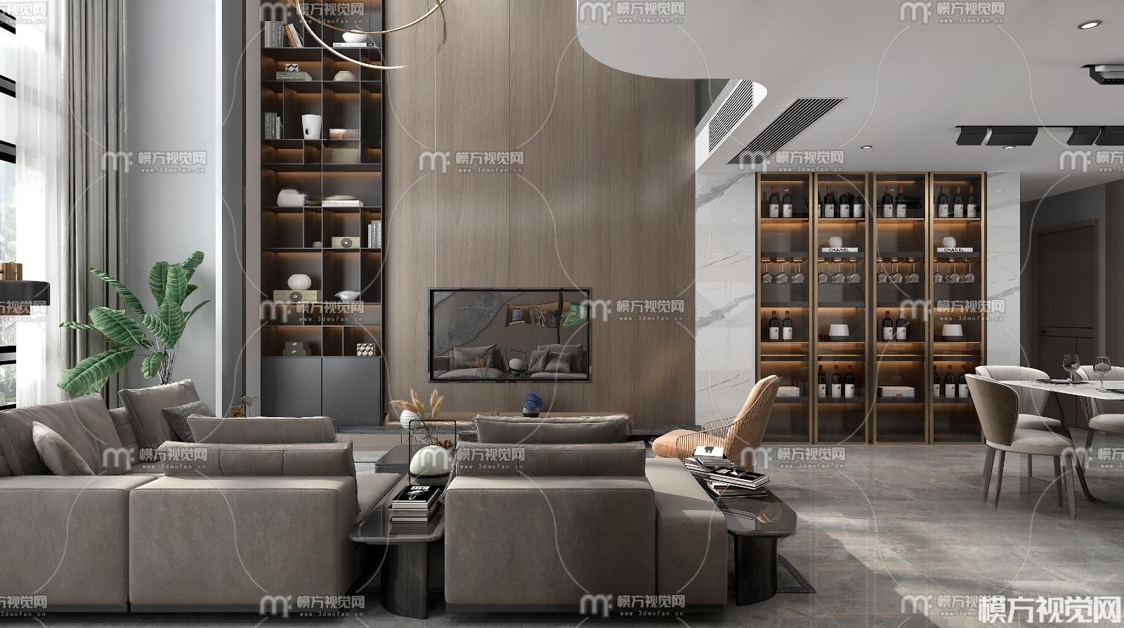 现代挑空别墅客餐厅3D模型(ID:0006036)