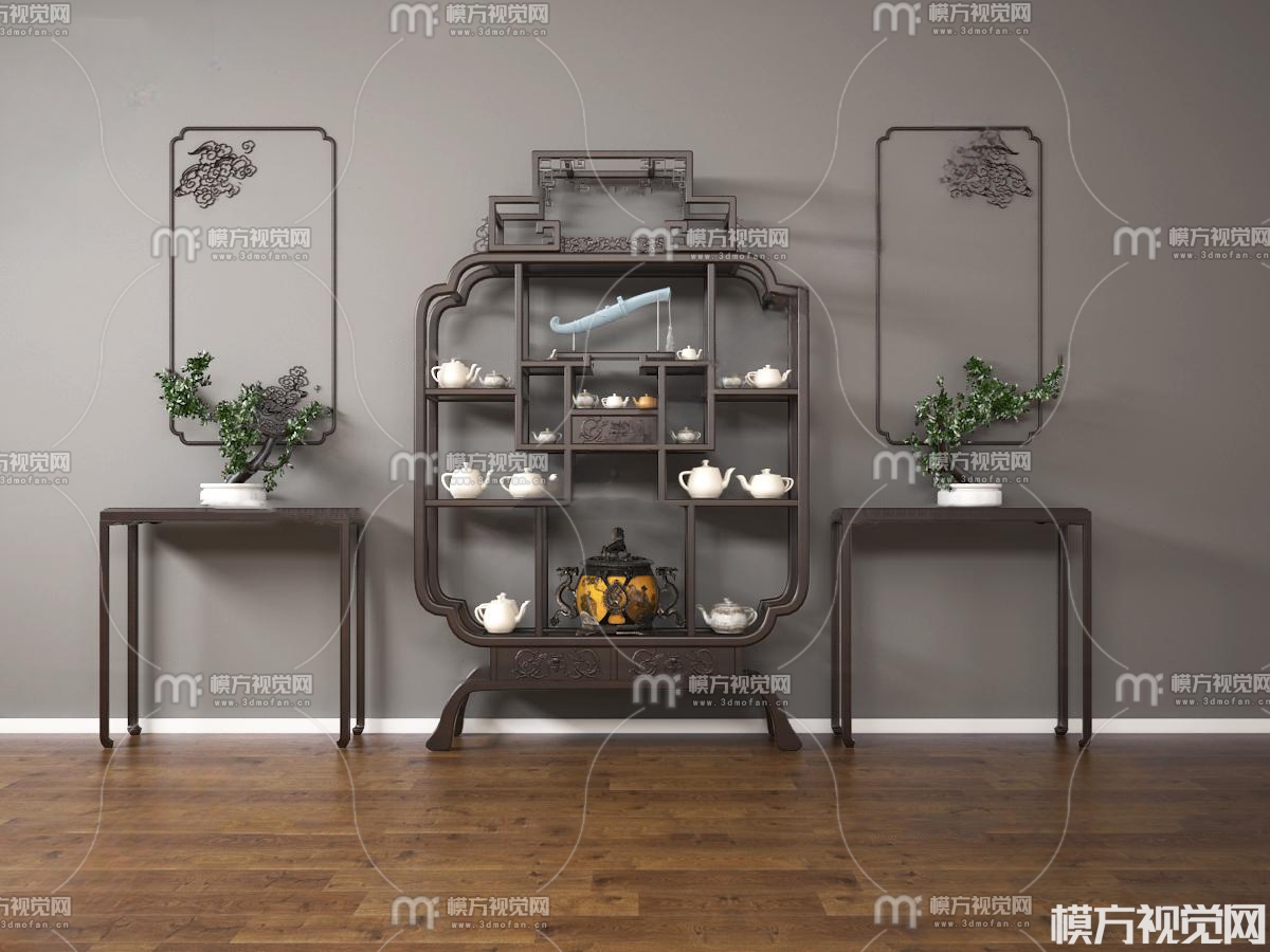 中式博古架端景台盆景组合3D模型(ID:0006211)