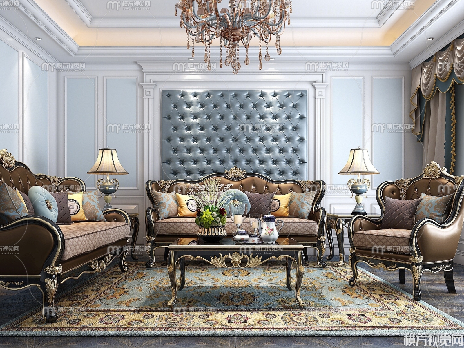 欧式沙发茶几 吊灯组合3D模型(ID:0000835)