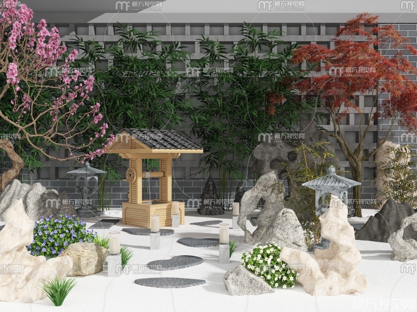 新中式竹子 假山 水井园艺小品3D模型(ID:0008607)