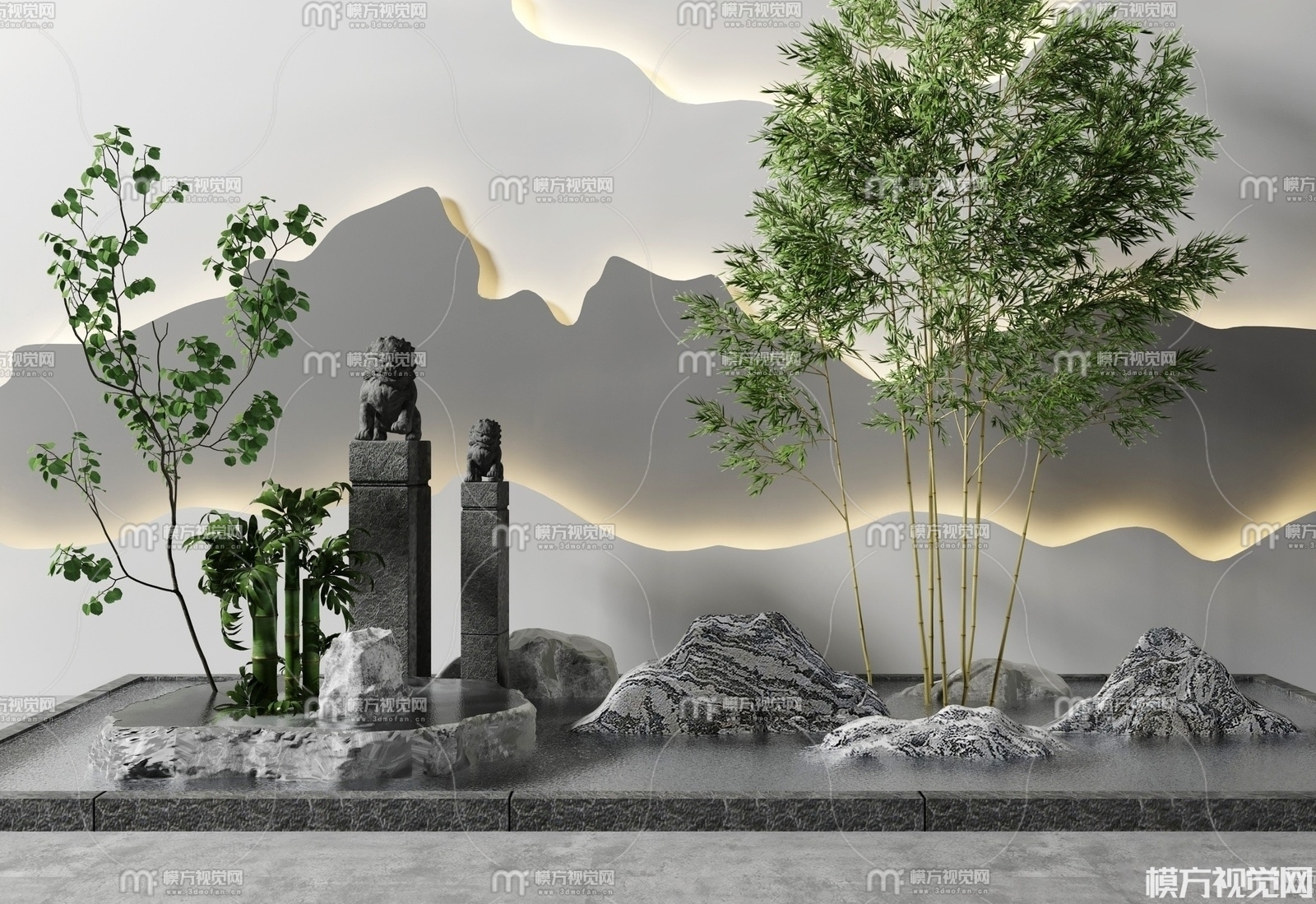 新中式假山 水景 竹子园艺小品3D模型(ID:0008609)