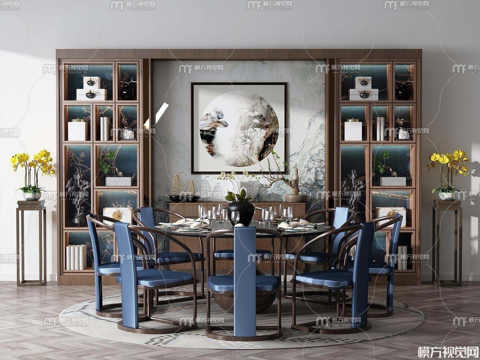 新中式圆形餐桌椅 酒柜3D模型(ID:0008766)