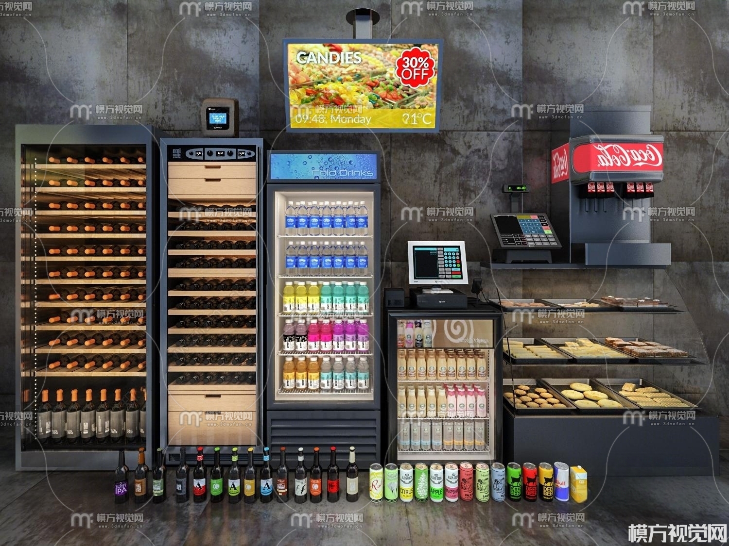 现代酒柜 冰柜 蛋糕柜 饮料 收银机3D模型(ID:0000897)