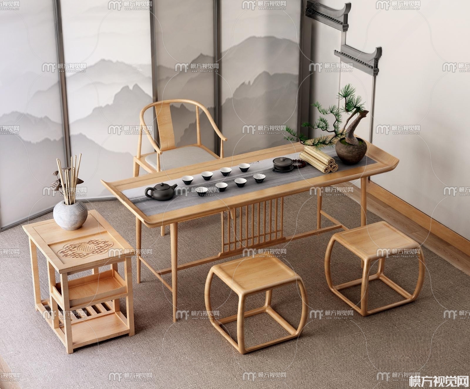 新中式茶桌椅3D模型(ID:0009055)