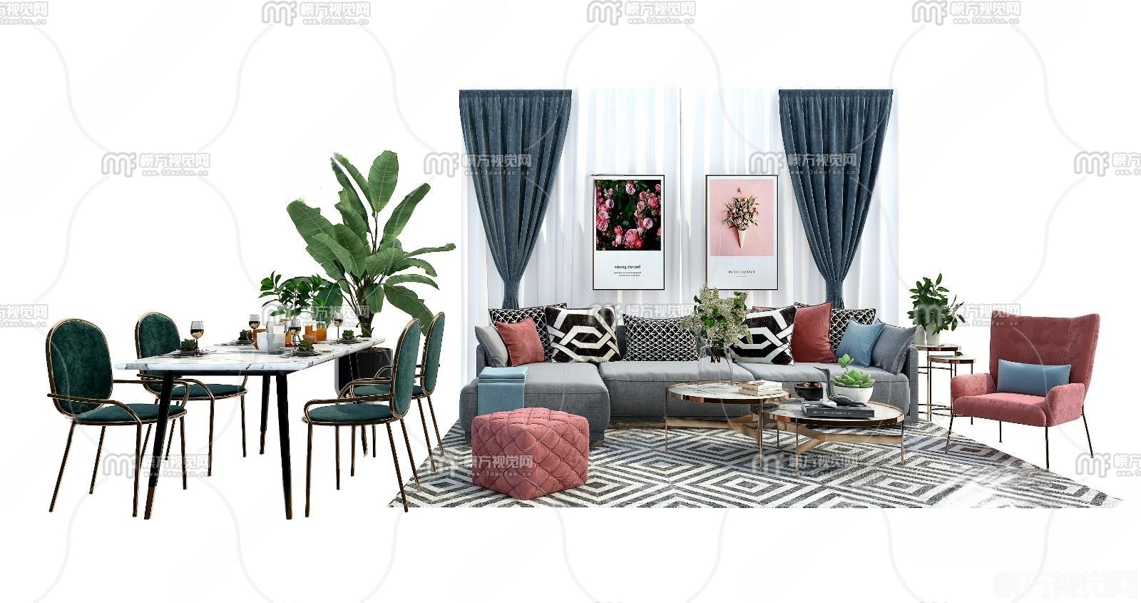 现代沙发茶几餐桌窗帘3D模型(ID:0009451)