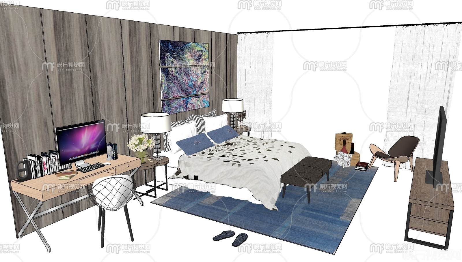 现代双人床 书桌椅 电视柜SU模型(ID:0002968)