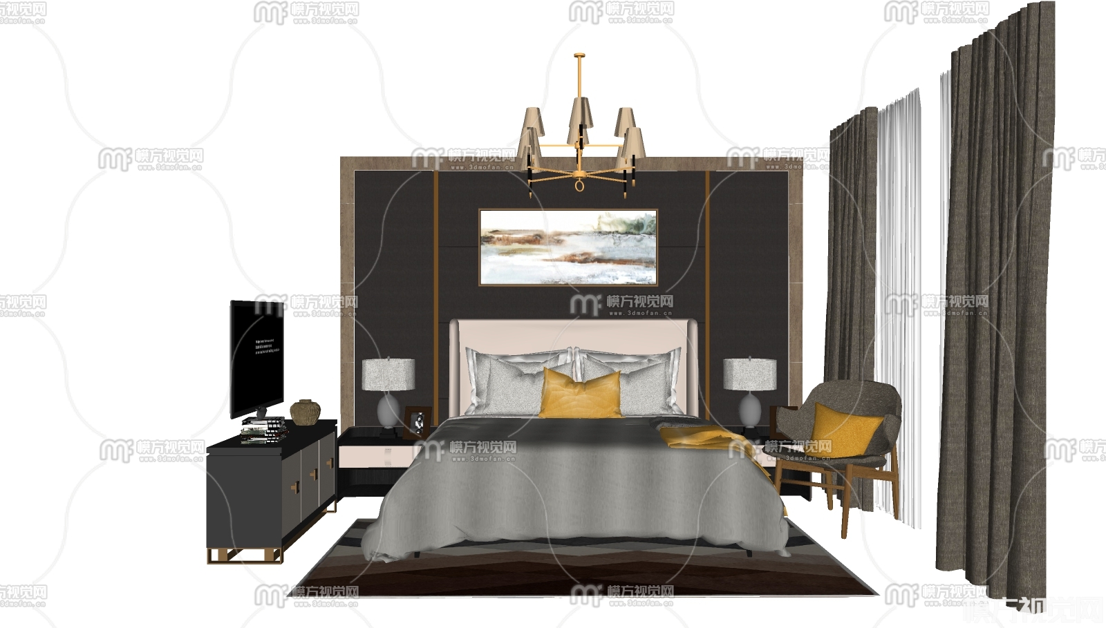 现代双人床 电视柜 窗帘SU模型(ID:0002974)